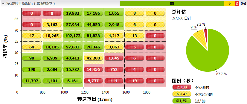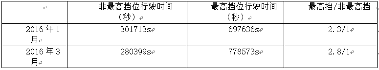 将车辆尽量保持在高挡位,也是让车辆达到最佳经济性的方法之一。从上表可以看出,先比1月份,该车辆3月份挡位配合得更好,最高挡行驶占比更大。