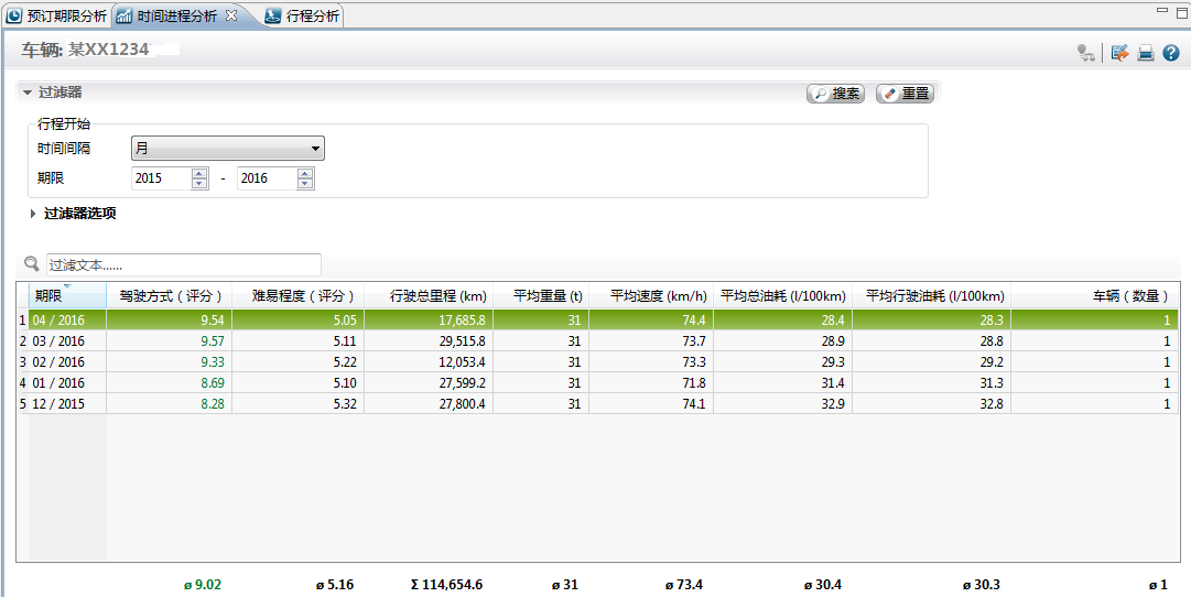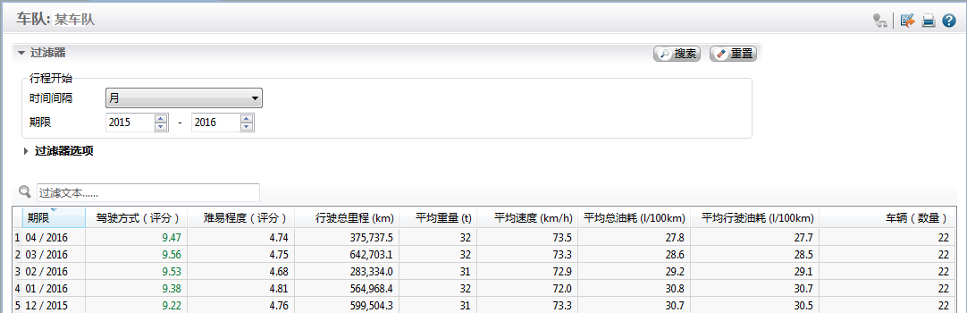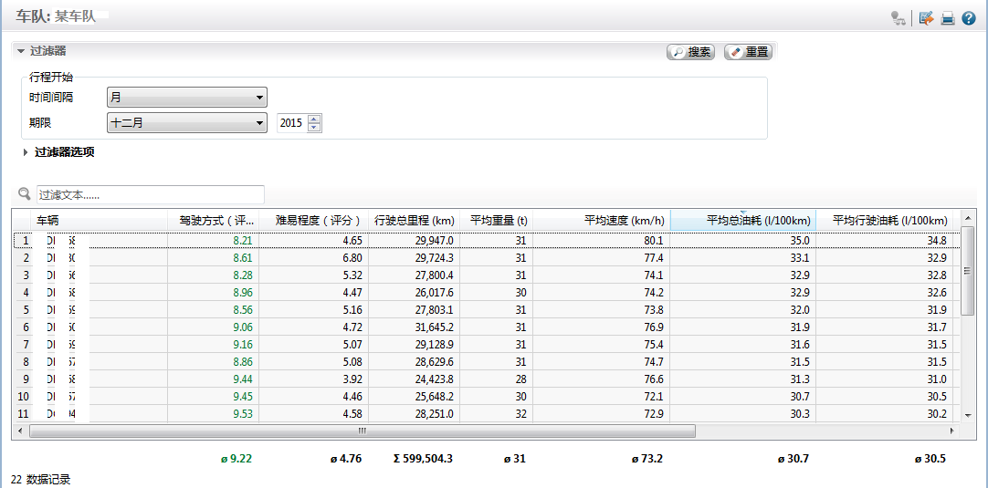可以看出,在车队平均重量、平均速度基本保持不变的情况下,车队4台车平均驾驶得分稳步上升,从8.7分提升至稳定在9.5分;车队平均油耗逐月下降,从接近32L/100km,下降至27.5L/100km,平均油耗下降4.5L,降幅达13.7%。