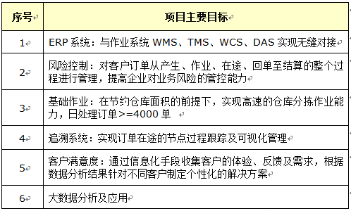 本次项目旨在通过广东益邦物流专业的供应链解决方案及信息系统集成实施能力,对卫康公司的配送中心进行库存管理、订单处理、在途跟踪及客户服务管理,提高卫康公司的库存周转率、快速处理销售订单的仓库分拣作业、实现订单位在途的可视化跟踪、缩短客户订单的交付周期、提升终端客户的满意程度,从而整体提高卫康公司的供应链协同管理能力。