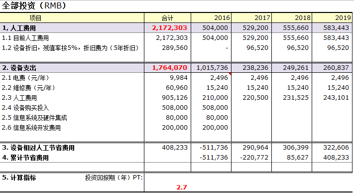 该项目实施之前主要采用人工打单、拣货作业,正常订单量每天需要4名工人进行单据打印,11名员工进行订单拆零拣货作业,高峰期间加班情况比较严重。项目投入使用后,单据、系统操作人员调整到1名,拣货人员调整到5名,每小时拣货数量可高达400箱,约270张订单;拣货效率提高50%;单从订单拣选环节的经济效益分析来看,该项目就具备较好的经济效益,见下表: