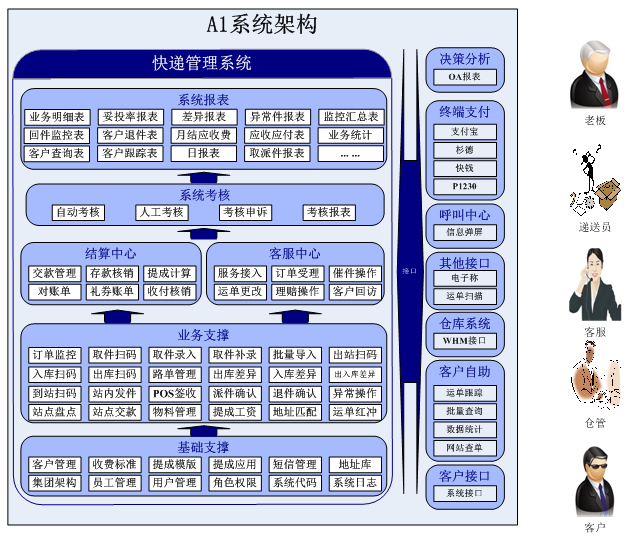 A1快递管理软件系统(后文称为“A1系统”)为多级别物流企业的信息化管理软件,完成了物流实操管理、费用结算、决策预警分析报表等多方面的支持。系统主要模块功能有:运单管理、人员管理、报表管理、结算管理、个性化定制、考勤管理、人员定位、以及020服务。以下为A1快递管理系统的6大特色: