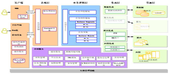 4) 表现层使用Web Service 和http技术进行接口封装,形成基于Session安全机制的服务接口,供各种前端应用调用。