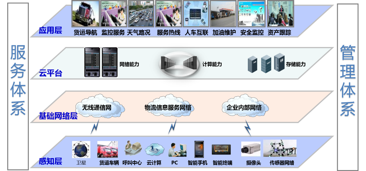 基于移动互联技术的电商快递物流透明管理平台系统包括感知层、基础网络层、云平台和应用层四部分构成。感知层依靠各种智能传感终端和设备负责卫星信号和外设信号(包括经纬度、速度、里程等)的获取和接入;基础网络层即数据传输网络,本系统依靠联通3G/4G通信网络对接入的数据进行无线传输;云平台层负责把采集到的数据进行逻辑判断和处理,供应用层调用。应用层为平台功能层,供用户直接使用。下图是系统的总体结构图示: