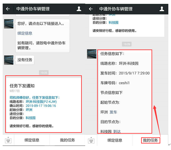 司机在关注“中通外协车辆管理公众号”之后,就可以在线接受系统的下发任务,手机端成为查阅运输任务和要求信息的新工具。下图左图是进入公众号的页面,右图是获取运输任务的页面。页面中现实了本次运输任务的基本要求。如路线、时间等。