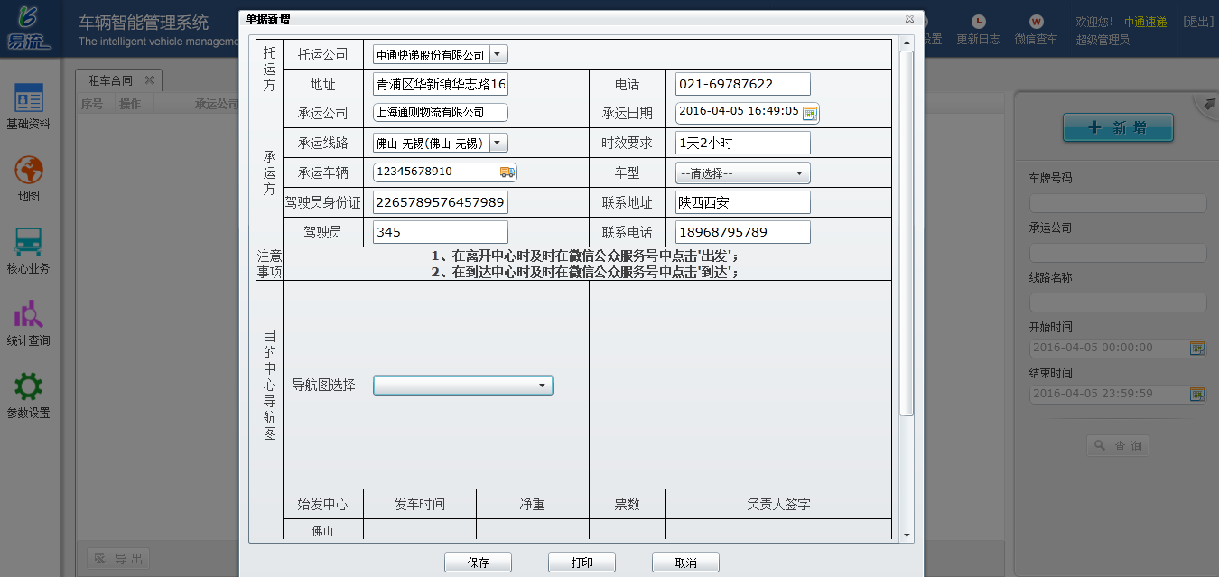 当然,该运输任务信息是PC端平台下发的,具体的操作页面如下图所示:在本页面中,只要填写了托运公司、承运公司、地址、承运车辆、司机信息、时效要求、联系人信息即可发送给指定的司机,即运输任务推送成功。司机拿着本页的打印纸张开始运输任务。其中,司机的信息需要全面准确,需要对其资质进行验证和审核,保障货物安全和运输啊安全。