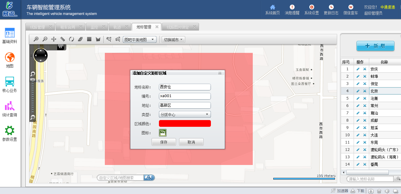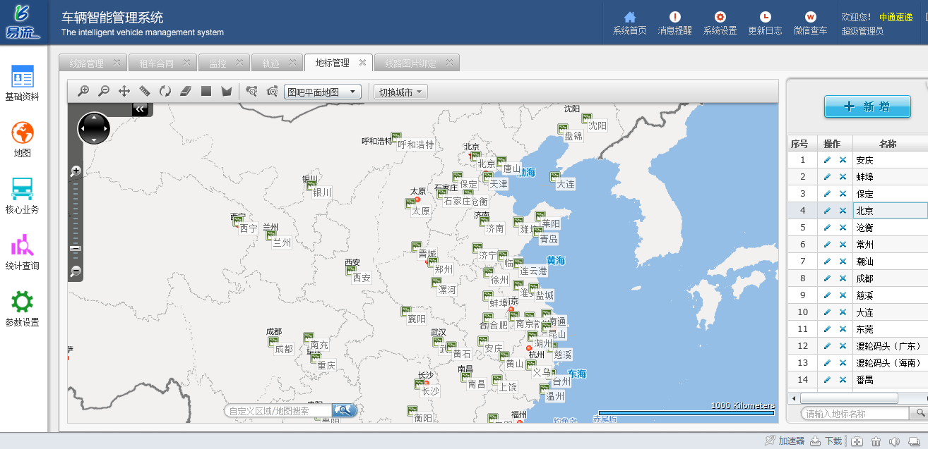 就是对中通快递各个分拨中心全部按照实际位置对应标注在电子地图上,使得以上各区域均被监管中,监管者能及时看到其状态。上图是这些点信息的添加页面,单击“新增”填写名称、标号、地址、类型、颜色、图标后保存即可在地图上添加此位置。下图是标注好后的全国范围内的分拨中心分布地图。单击每一个名称都可以直接定位到对应的分拨中心位置。