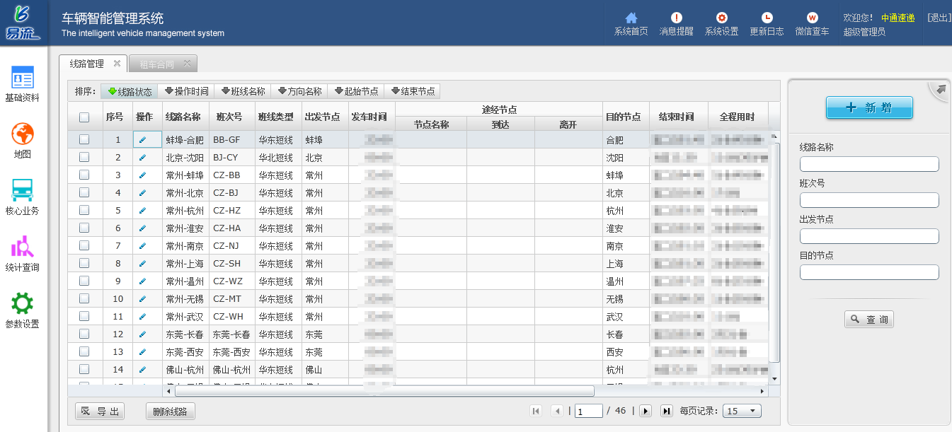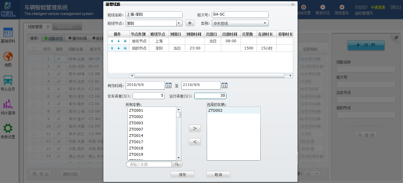 上图是线路生成页面,选择班线节点(即第一步中已标注过的网点)后,再按照实际填写发车时间和到达时间(这里的时间为系统中的“计划时间”,后续要作为准点率的判断依据,所以务必合理、准确),即可生成一条运输线路。