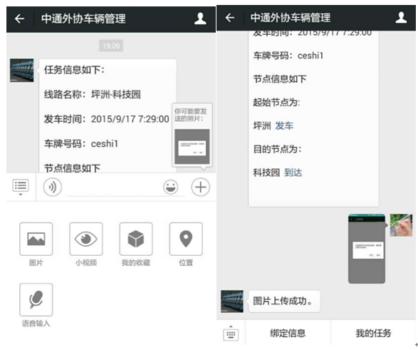 本案例中异常信息的采集由司机本人通过自己的智能手机,用微信的拍照、位置、语音、视频、时间等等功能实现,不需要再投入任何外部设备。具体信息反馈成功后,可以作为企业对运输过程中实际情况的参考,作为考核司机的参考和证据。下图就是司机使用拍照上传功能实现操作行为数据上报。