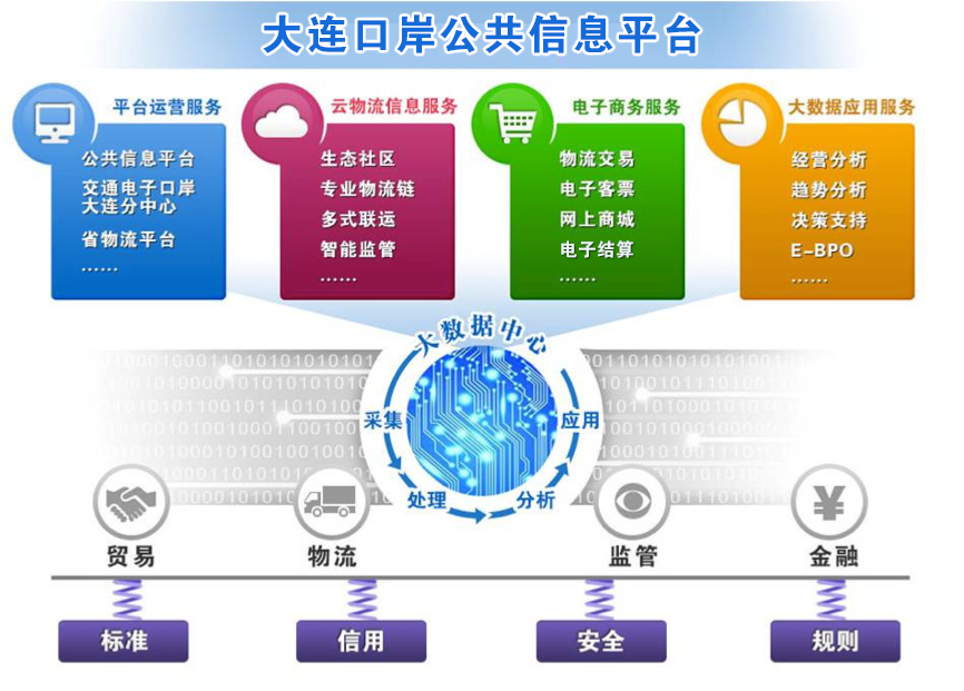 大连口岸公共信息平台的建设通过对整个口岸业务信息、操作指令等进行传输、存储、加工、处理,搭建畅通无阻的信息平台,实现贸易及物流业务操作电子化、网络化,从而提高物流行业信息流流转速度以及业务主体间的业务交互效率,达到信息流与物流及业务操作进程的及时响应、准确匹配,最终促进贸易物流行业效率、行业竞争能力以及陆桥经济的软环境综合服务能力的提升。
