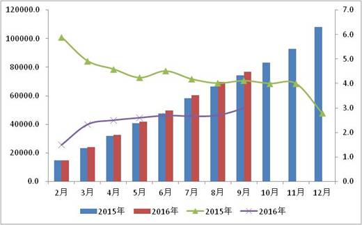 社会库存明显回落,周转加快。前三季度,“降成本”“去库存”等任务取得了一定实效。一方面,社会库存水平明显回落,数据显示,1-8月规模以上工业企业产成品库存比上年同期下降1.6%,9月制造业PMI中的产成品库存指数为46.4%,连续2个月下降,且低于去年同期。其中特别是水泥、钢铁、有色、铝冶炼等过剩产业库存同比均保持下降走势;另一方面,库存周转有所加快。中国仓指指数显示,平均库存周转次数指数连续回升,特别是8月升幅明显加快,升至58.3%,9月在此基础上再次提高0.2个百分点,创出近六个月的高点。