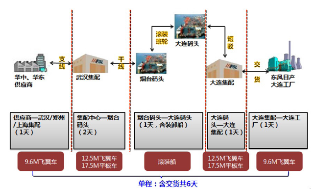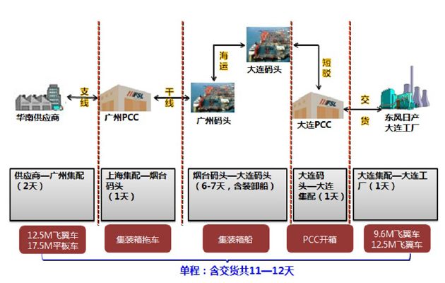 作为东风日产“北上”战略的重要布局,大连工厂与现有的广州、襄阳、郑州三大生产基地实现了东风日产南北纵横全新格局。首款P32R车型是作为平衡车型在大连、郑州两地生产,供应商多数落户在华北、华东地区,迫切需要解决从南方向大连长途运输的课题,而且需要尽可能削减长途运输带来的昂贵调达物流费用。同时,大连工厂地处大连保税区,如何充分利用便利的海运物流条件,实现南北海运对流降低成本成为了工厂投产前重要的创新课题。