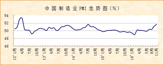 雷竞技电竞竞猜网 、国家统计局服务业调查中心发布的2016年11月份中国制造业采购经理指数(PMI)为51.7%,较上月上升0.5个百分点,该指数最近两月上升明显,指数水平达到2014年8月份以来的最高值,高于去年同期2.1个百分点。主要分项指数新订单、生产、采购量指数普遍回升,高于去年同期2个百分点以上。综合来看,当前经济运行态势良好,企稳基础进一步巩固,向好发展态势更为明显。