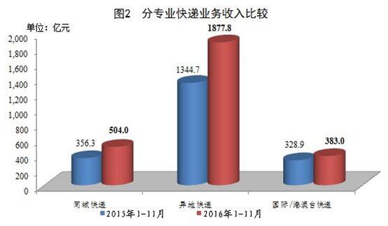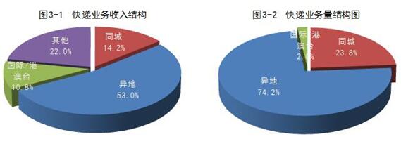 1-11月份,同城、异地、国际/港澳台快递业务收入分别占全部快递收入的14.2%、53%和10.8%;业务量分别占全部快递业务量的23.8%、74.2%和2%。与去年同期相比,同城快递业务收入的比重下降0.3个百分点,异地快递业务收入的比重下降1.7个百分点,国际/港澳台业务收入的比重下降2.6个百分点。