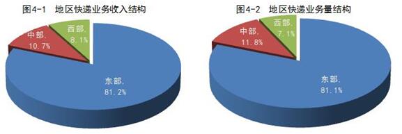 1-11月份,东、中、西部地区快递业务收入的比重分别为81.2%、10.7%和8.1%,业务量比重分别为81.1%、11.8%和7.1%。与去年同期相比,东部地区快递业务收入比重下降了0.7个百分点,快递业务量比重下降了0.9个百分点;中部地区快递业务收入比重上升了0.4个百分点,快递业务量比重上升了0.6个百分点;西部地区快递业务收入比重上升了0.3个百分点,快递业务量比重上升了0.3个百分点。