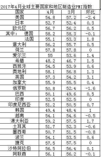 2017年4月全球主要国家和地区制造业PMI指数