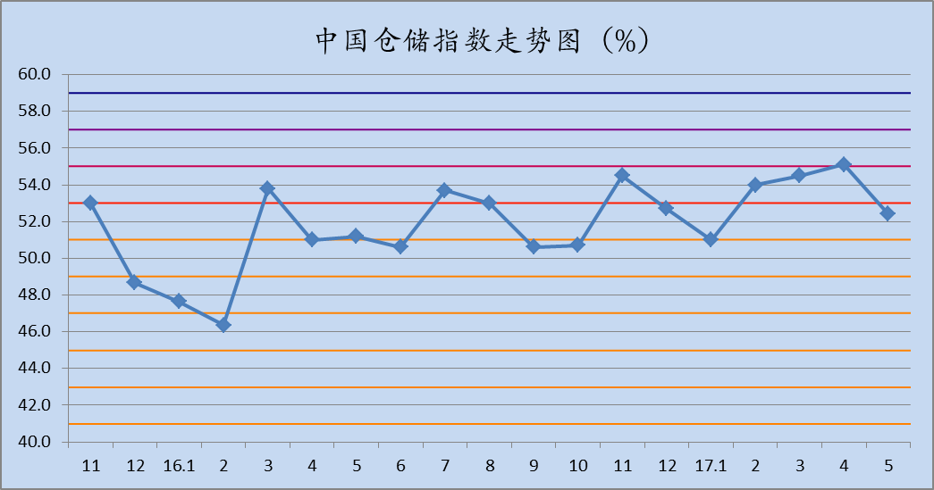 雷竞技电竞竞猜网 与中储发展股份有限公司联合调查的2017年5月中国仓储指数为52.4%,较上月回落2.7个百分点,连续十五个月位于扩张区间。各分项指数中,延伸业务量指数与上月持平,业务量指数、收费价格指数、业务利润指数较上月有所回升,其余指数均有不同程度的回落。