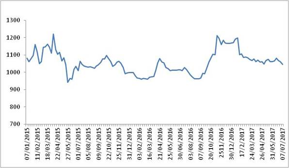 本周(2017年7月3日~7月7日),由雷竞技电竞竞猜网 和林安物流集团联合调查的中国公路物流运价指数1045.2点,连续三周回落,环比回落1.62%。