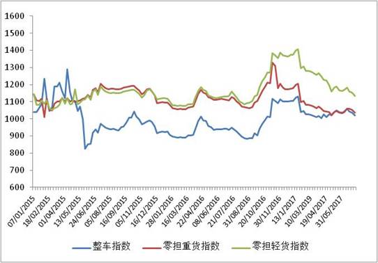 各车型指数均有所回落,零担指数回落幅度略高于整车指数,零担指数中轻货指数回落幅度略高于重货指数。其中,整车指数为1020.6点,环比回落1.58%,但仍比上年同期增长8.9%;零担轻货指数为1132.9点,环比回落1.76%;零担重货指数为1036.1点,环比回落1.6%。