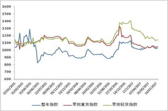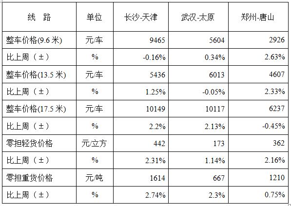 各车型指数波动幅度较小,整车指数环比持平,零担指数小幅回落。零担轻货指数回落幅度高于零担重货指数。其中,整车指数为1029.8点,与上周持平,比上年同期增长9.5%;零担轻货指数为1139.7点,环比回落0.19%;零担重货指数为1045.3点,环比回落0.09%。