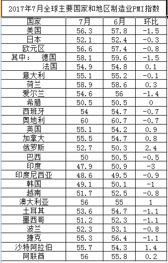 2017年7月全球主要国家和地区制造业PMI指数
