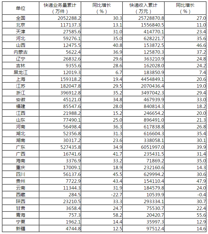 1-7月,全国快递服务企业业务量累计完成205.2亿件,同比增长30.3%;业务收入累计完成2572.9亿元,同比增长27%。其中,同城业务量累计完成47.8亿件,同比增长24.1%;异地业务量累计完成153.2亿件,同比增长32.4%;国际/港澳台业务量累计完成4.3亿件,同比增长29.5%。