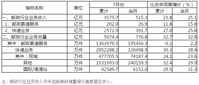 7月份,邮政服务业务总量完成136.5亿元,同比增长31.4%;邮政寄递服务业务量完成19.5亿件,同比增长2.2%;邮政寄递服务业务收入完成26.9亿元,同比增长15.8%。