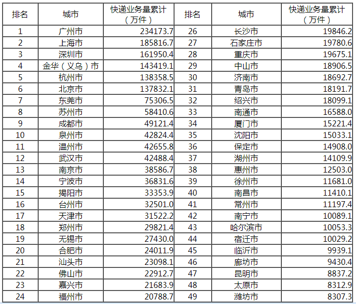 1-8月,全国快递服务企业业务量累计完成237.9亿件,同比增长30.2%;业务收入累计完成2976.9亿元,同比增长27%。其中,同城业务量累计完成55.6亿件,同比增长25.1%;异地业务量累计完成177.4亿件,同比增长31.9%;国际/港澳台业务量累计完成4.9亿件,同比增长31.1%。