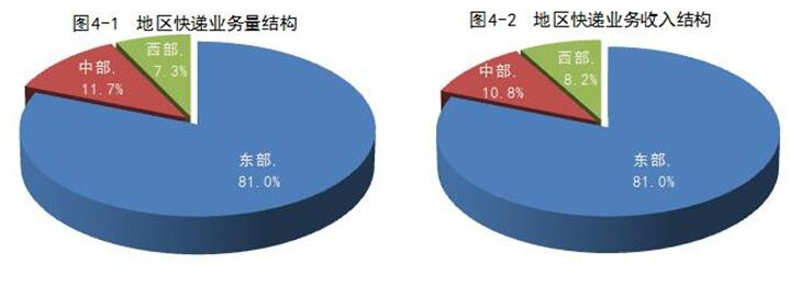 1-8月,东、中、西部地区快递业务量比重分别为81%、11.7%和7.3%,业务收入比重分别为81%、10.8%和8.2%。与去年同期相比,东部地区快递业务量比重下降了0.1个百分点,快递业务收入比重下降了0.2个百分点;中部地区快递业务量比重下降了0.1个百分点,快递业务收入比重上升了0.1个百分点;西部地区快递业务量比重上升了0.2个百分点,快递业务收入比重上升了0.1个百分点。