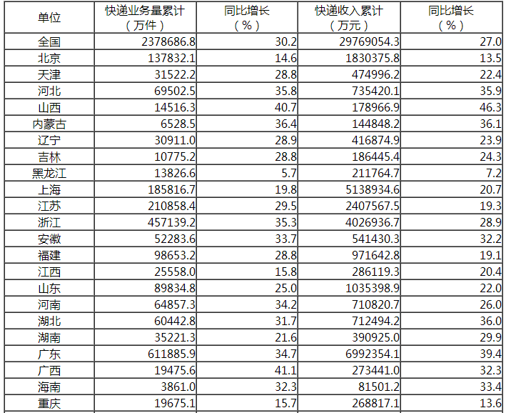 8月,全国快递服务企业业务量完成32.6亿件,同比增长29.4%;业务收入完成404亿元,同比增长27.2%。