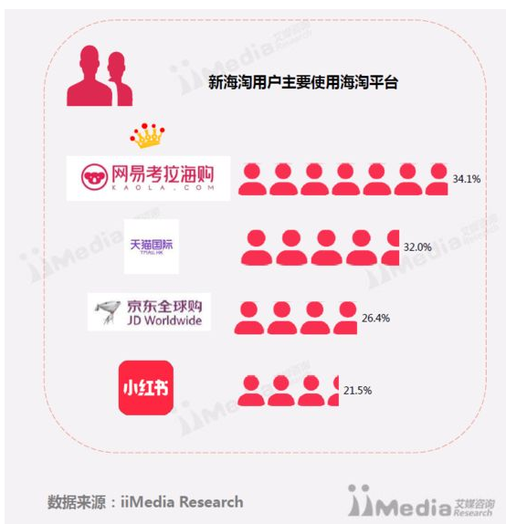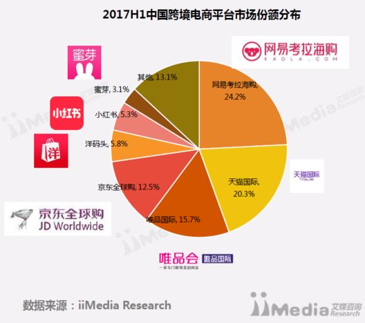 再看艾媒咨询的2017上半年中国跨境电商市场研究报告,网易考拉海购以24.2%的市场份额占比排在首位,天猫国际(20.3%)、唯品国际(15.7%)、京东全球购(12.5%)、洋码头(5.8%)、小红书(5.3%)、蜜芽(3.1%)依次位列其后。