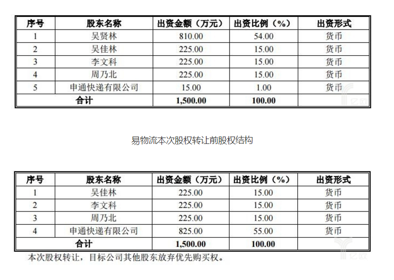 11月15日晚间消息,申通发布《关于全资子公司收购上海申通易物流有限公司部分股权并对其增资暨关联交易的公告》(以下简称“公告”)。公告称,申通快递拟以10648.80万元收购关联人吴贤林(以下简称“出让方”)持有的上海申通易物流有限公司(以下简称“易物流”)54.00%的股权。而吴贤林为公司实际控制人之一陈德军先生配偶之弟。收购之后,申通快递占易物流的股权份额将从1%上升为55%。