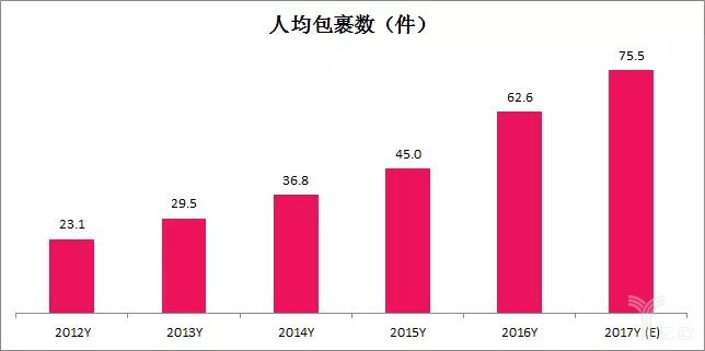 →人均包裹数持续走高,17年网购人群人均包裹数达75.5件: