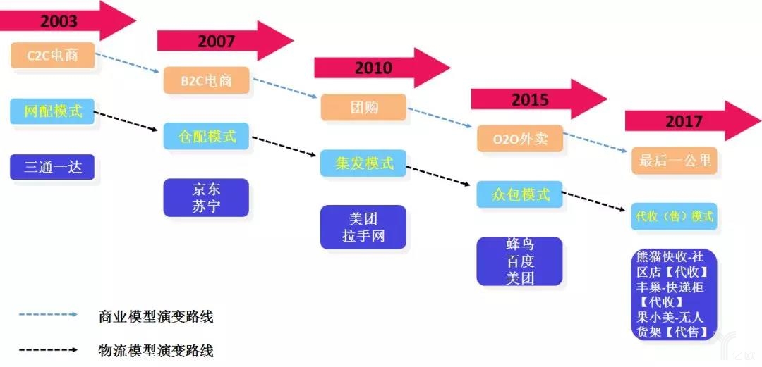 从2003年以淘宝为代表的C2C电商的蓬勃发展,到2007年以京东为代表的B2C电商及垂直电商开始发力,以及2010年以美团为代表的团购兴起,2015年以饿了么为代表的外卖O2O加速扩张,再到2016以来的品质电商、社交电商开始萌芽,2017年疯狂布局阿里的新零售和京东的无界零售。每个时期都有一些新的商业模式出现,不仅成就了一批优秀的企业家,同时改变了人们的消费习惯,更是促进了诸如支付、物流、APP等周边产业的欣欣向荣,其中物流是现代商业革新过程中衍生的最典型的受益行业。