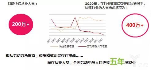 在包裹数高速增长的背景下,未来快递从业人员需求量将遇到前所未有的压力,据阿里研究院测算,到2020年,快递从业人员将突破400万人,而目前从业人员仅200多万人,要使从业人员两年内翻一番,传统末端派送模式将遇到巨大挑战。