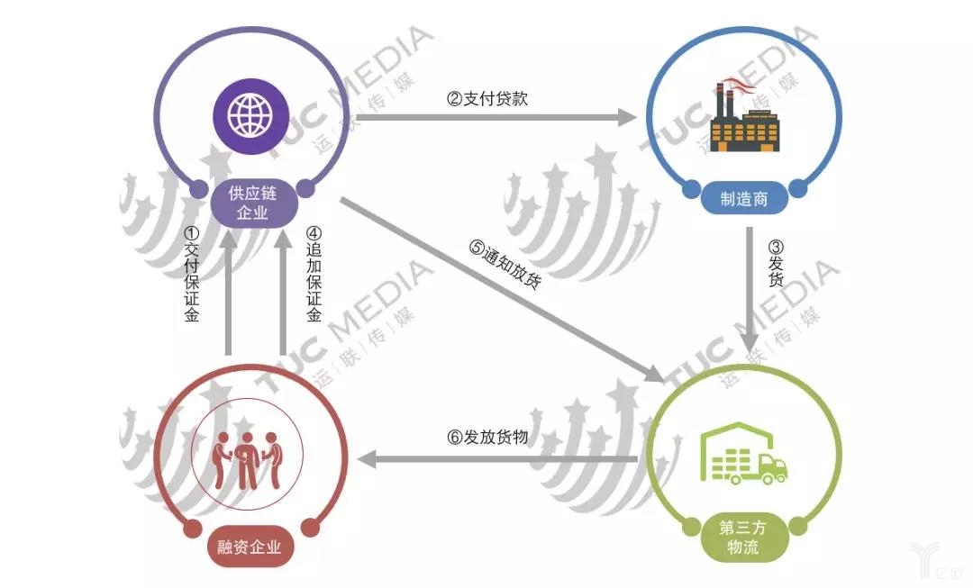 目前国内供应链贸易企业常用的方式为先票/款后货贷款,其担保的基础为采购方对制造商的提货权。供应链参与主体共同签订协议,供应链企业通过代付采购款方式对融资企业融资,第三方物流作为库存货的监管方对库存进行监管。