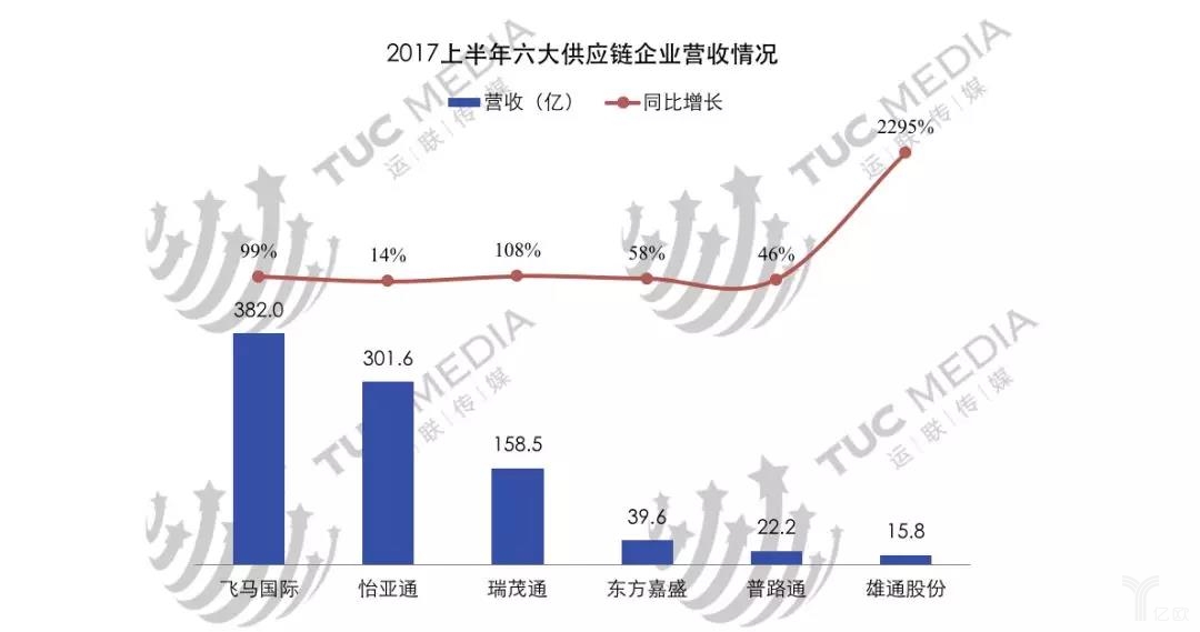 大型供应链企业以物流为基础,深化“1+N”供应链模式,打造供应链金融生态,规模快速扩张。下图为2017年上半年六大供应链企业营收情况: