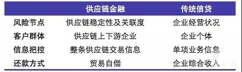 供应链金融与传统信贷最大的差别在于,利用供应链中核心企业的资信能力,基于交易过程向核心企业和其上下游相关企业提供综合金融服务。在风险节点、客户群体、信息把控、还款方式方面有本质区别。