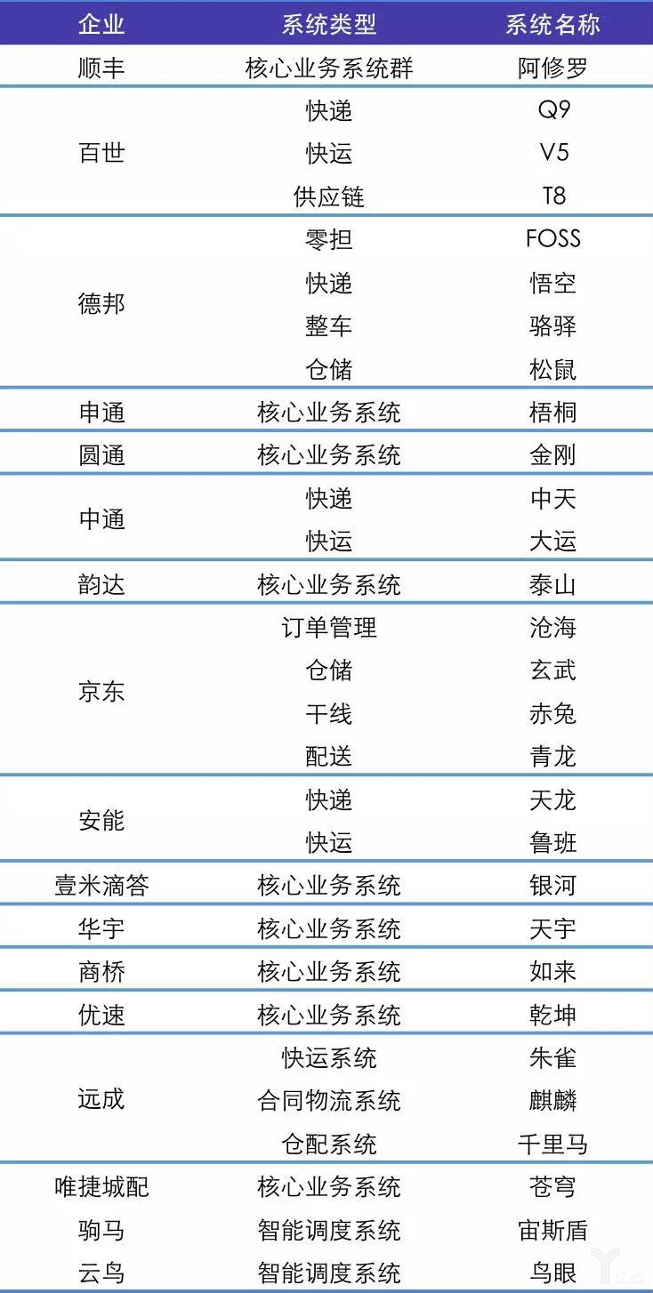 百世的系统是字母加数字的组合,体现了西方文化的风格;顺丰的阿修罗和即将面世的舒华都是佛教的神,体现了王卫的佛教信仰;德邦的则是比较活泼、松鼠、骆驿、悟空代表了德邦年轻人的朝气;壹米滴答的银河、商桥的如来等则是体现了新模式企业家创业的伟大梦想。