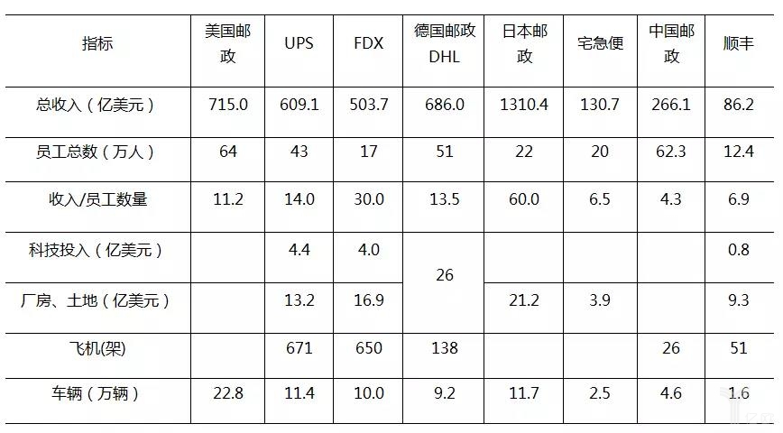 2016年,我国快递业务收入为602亿美元,仅为当年美国的1/4。从单个企业来看,日本邮政员工人均收入(营业收入/员工人数)最高,为中国邮政的员工人均收入15倍左右。收入差距之高与企业在人力和科技等要素投入有关。综合实力的较量已经成为企业未来发展的关键,强大的航空和陆上运力资源、大规模的配送网络和中转中心,拥有整合其他物流网络的能力以及在业务区域内快速有效的通关能力,辅以先进的实时跟踪和运营控制计算机技术,才能在这一领域立足。顺丰2016年在科技方向投入仅为UPS的1/5,日本邮政在厂房和土地方面的投入为顺丰的2倍多,UPS的飞机数量为中国邮政的25倍,美国邮政的运输车辆为顺丰的14倍。我国邮政业虽然相对成熟的国外企业发展迅速,但企业综合实力的提升才是未来竞争的关键。