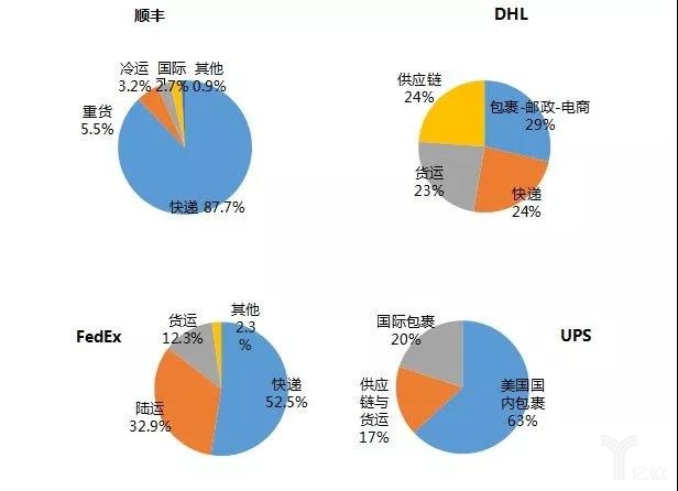 德国邮政DHL服务功能分配最均衡,UPS和FDX虽然都有综合性物流业务但仍然偏重快递业务。国内最先进的顺丰,重货、冷链、国际等新兴业务占比仅为11.4%。
