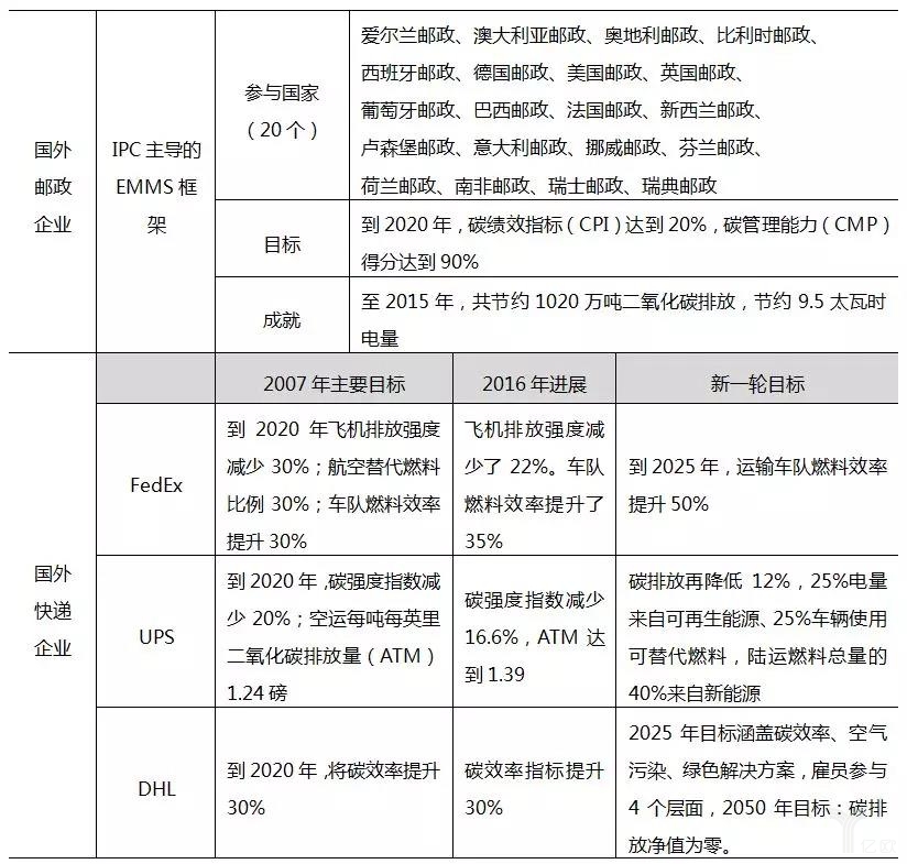 IPC于2008年设定环境监测和测量系统(EMMS)框架,目前已有20个国家的邮政企业参与,承诺到2020年,碳绩效指标(CPI)达到20%,碳管理能力(CMP)得分达到90%。2014年,CPI指标提前完成目标,2015年CMP得分已达85%。其中,美国邮政、英国邮政等领军企业还在建筑物能源审计、屋顶资产管理、物料采购政策等方面积极作为。三大国际快递企业先后于2007年设定温室气体减排目标,提出2020年降低碳强度、提升碳效率、减少碳足迹等一揽子具体指标。经过持续努力,2016年三家企业都取得了阶段性成就,并设定新一轮目标。