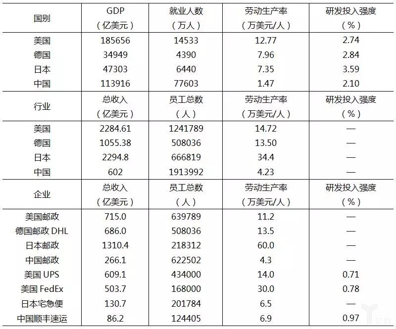 中美德日邮政业劳动生产率、研发强度及相关情况对比