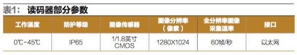本方案中使用的高性能读码器具有识别景深大、视野范围广、识别率高等特点。由于采用基于图像处理技术的优化算法,最大识别率可达到99.9%,且可以同时读取一维码和二维码,支持全方向和多个代码同时读取。读码器部分参数如表1。