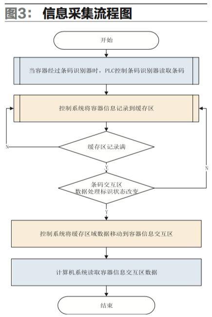 当箱式物料到达某个固定条码阅读器识读点时,控制系统将触发条码阅读器开始读取条码值,当PLC收到条码信息后将读码设备编号、条码信息、获取条码时间存入缓存区内。