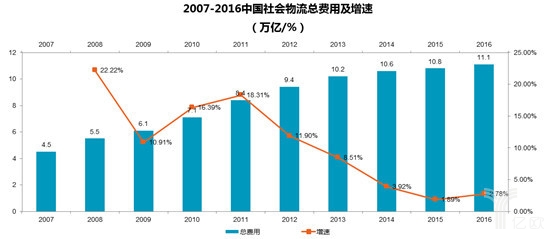 尽管物流行业发展竞争激烈,但社会物流总费用一直保持增长,2016年达到11.1万亿元,市场规模巨大。从数据可以看到,受宏观经济形势影响,2011-2015年全国社会物流总费用增速有所下降,2015年迎来增速拐点。可以预见,中国作为新兴经济体,物流市场规模仍将持续扩大。