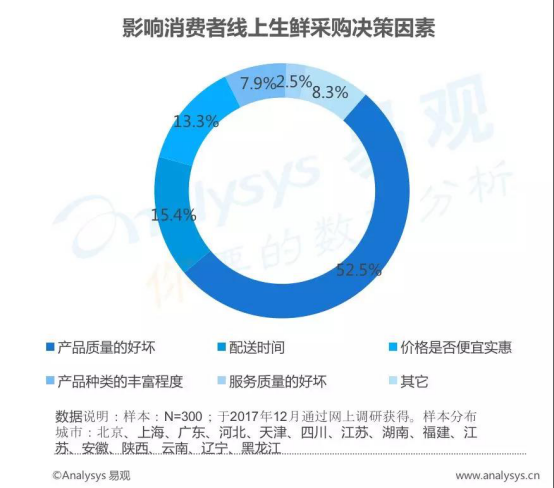 易观发布的2018最新生鲜电商用户画像显示,水果、奶制品、海鲜水产为消费者在线上常买的TOP3生鲜品类;而在采购生鲜时,产品质量、配送时间和价格是消费者主要考虑的三大因素。