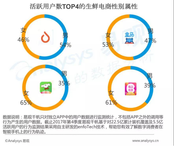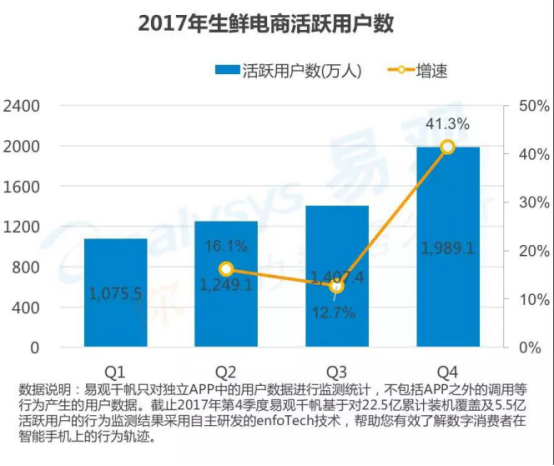2017年生鲜电商领域活跃用户稳步增长,网购生鲜消费习惯正在养成。近日,易观发布了2018最新生鲜电商用户画像。结合上月初易观发布的2018中国生鲜电商行业年度综合分析数据,生鲜电商仍处于持续稳步增长阶段。尤其是以多点Dmall、盒马鲜生为代表的头部品牌,正在引领着生鲜零售领域的升级和变革。