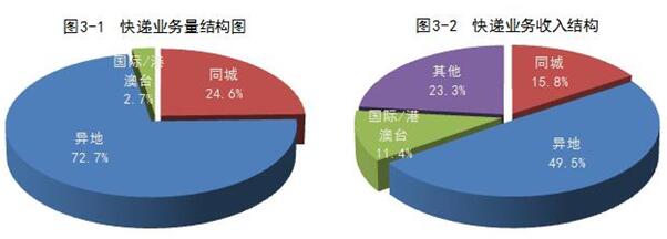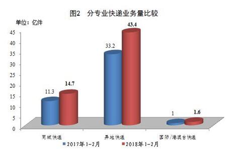 1-2月,同城、异地、国际/港澳台快递业务量分别占全部快递业务量的24.6%、72.7%和2.7%;业务收入分别占全部快递收入的15.8%、49.5%和11.4%。与去年同期相比,同城快递业务量的比重下降0.2个百分点,异地快递业务量的比重下降0.3个百分点,国际/港澳台业务量的比重上升0.5个百分点。