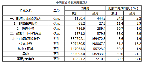 2月份,全行业业务收入完成444.8亿元,同比增长2.2%;业务总量完成579.3亿元,同比下降3.9%。