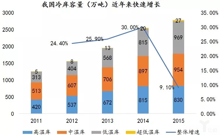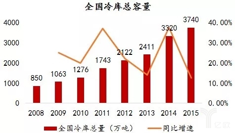 2015年冷库容量新增231万吨,增长9.1%,总体市场保持了较为稳健的增长态势。截至2015年底,中国冷库总容量为2779万吨,折合约为7199万立方米。考虑到冷链物流整体的发展速度,以及制冷行业景气度触底反弹,预计未来新建冷库容量增速将恢复。